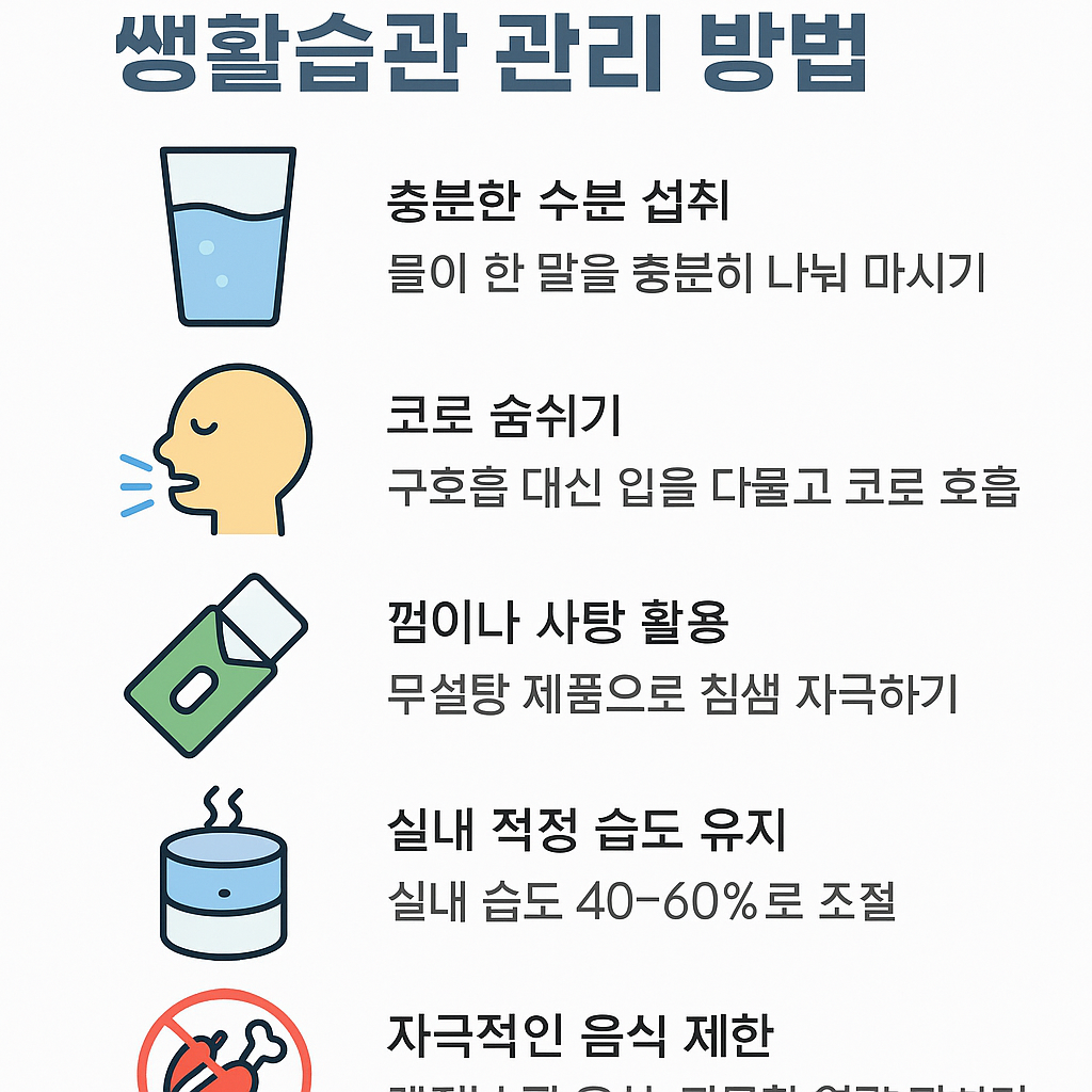 구강 건조증 환자는 치아와 잇몸 질환 위험이 높기 때문에 정기 검진이 중요합니다. 칫솔질은 하루 2~3회 부드러운 칫솔모로 하고, 불소 함유 치약을 사용합니다. 치실과 치간칫솔로 음식물 잔사를 제거해 세균 번식을 최소화합니다. 매운 음식, 짠 음식, 너무 뜨겁거나 찬 음식은 구강 점막을 자극하므로 피하는 것이 좋습니다. 구강 보습제는 외출 시에도 휴대해 필요할 때마다 사용하고, 수면 전에는 가습기를 틀어 밤새 건조하지 않도록 합니다. 스트레스 관리를 위해 명상, 가벼운 운동, 충분한 수면을 유지하는 것도 재발 방지에 필수입니다. 무엇보다 증상이 지속되면 치과·이비인후과 전문 진료를 통해 정확한 원인 분석과 맞춤 치료를 받는 것이 장기적인 해결책입니다.