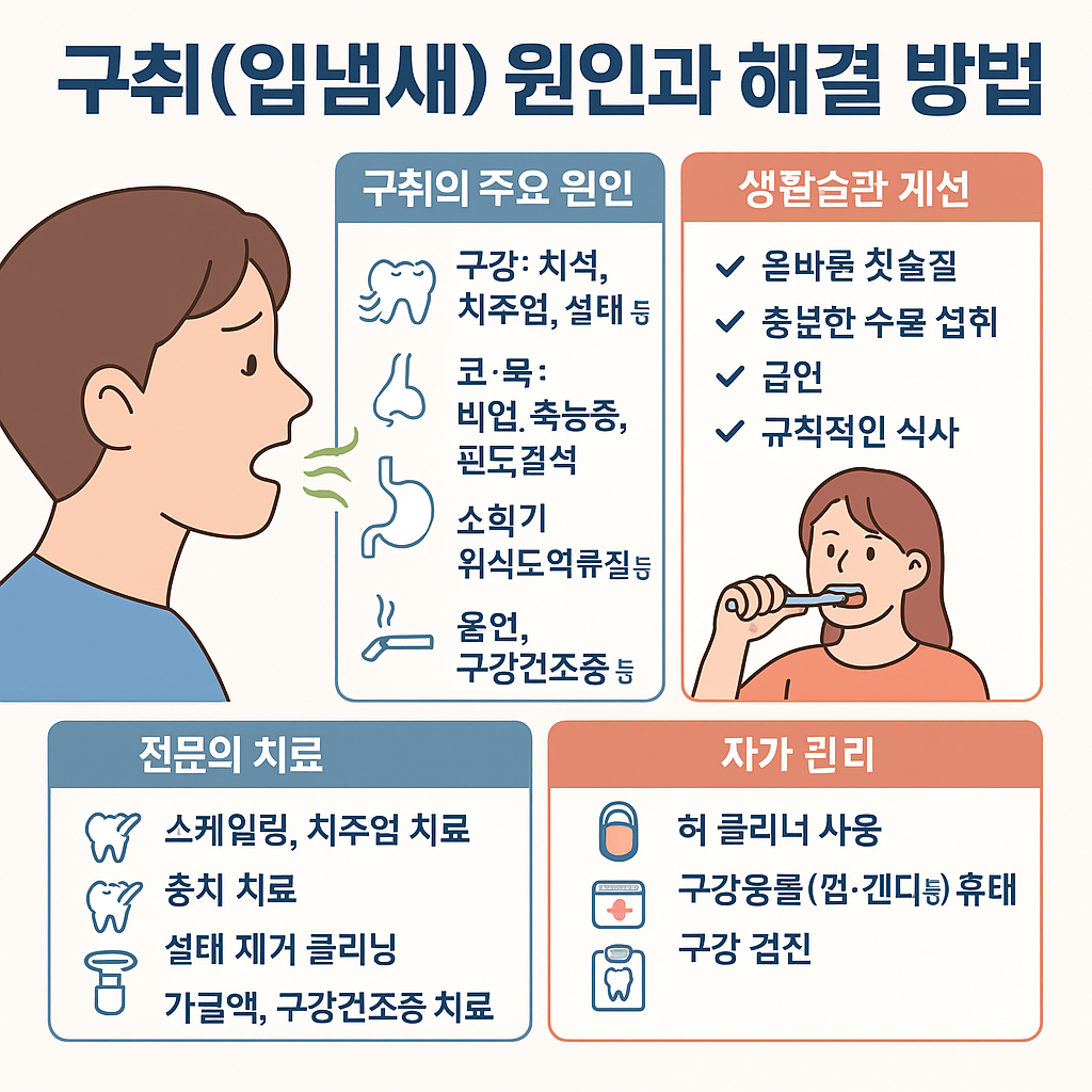 구취는 단순히 불쾌한 냄새의 문제가 아니라, 구강과 전신 건강 상태를 보여주는 신호일 수 있습니다. 원인을 정확히 파악하고, 올바른 생활습관과 치료를 병행하면 대부분의 구취는 개선됩니다. “숨 쉬기 불편한 순간”을 만들지 않으려면, 오늘부터 구강 관리 습관을 바꾸는 것이 최선입니다.
