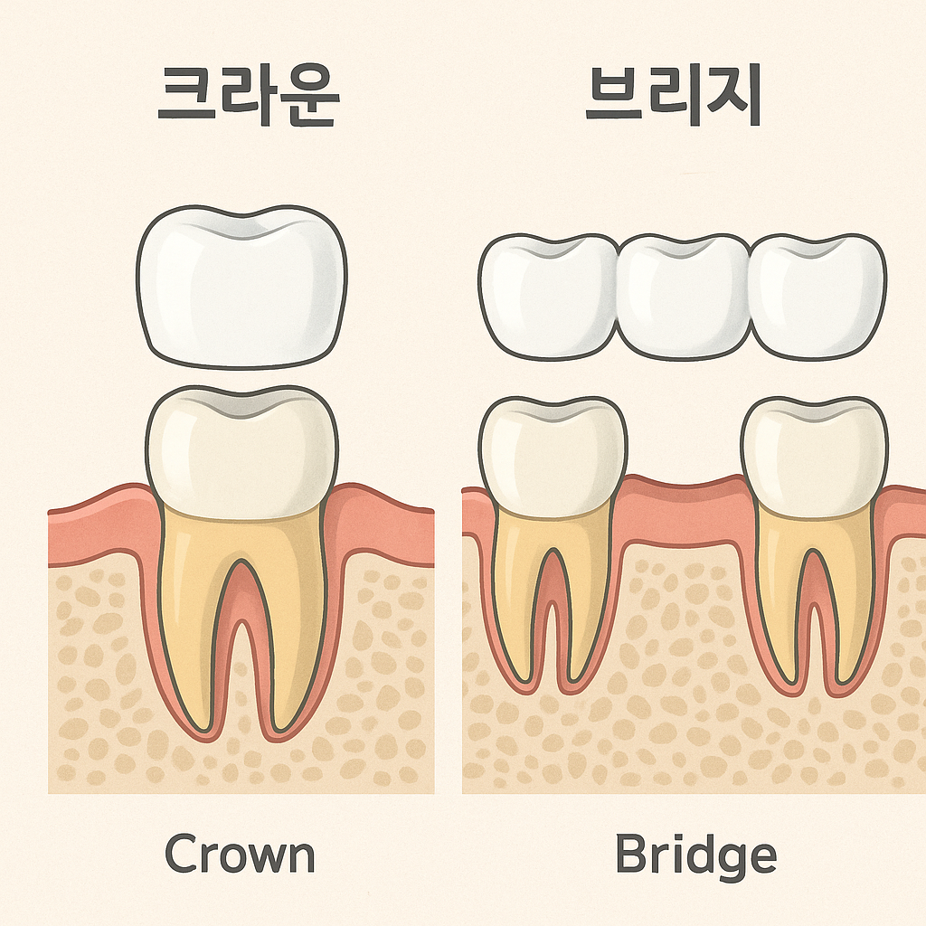 크라운은 약해진 치아를 지키고, 브리지는 사라진 치아를 연결합니다.